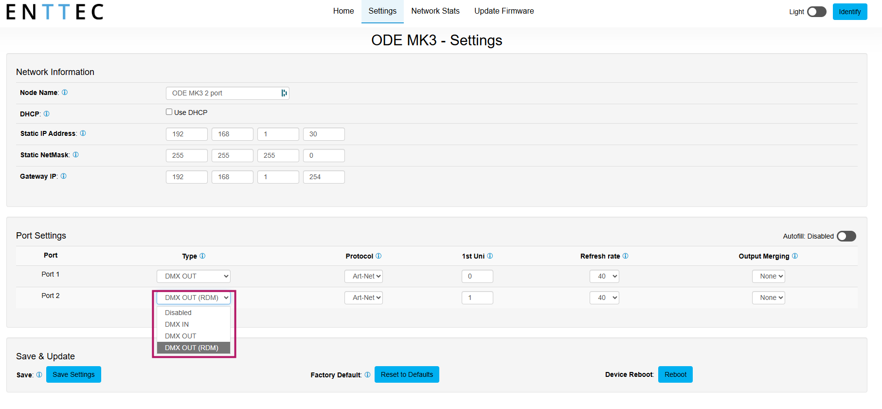 In the output settings of your Ethergate , ODE or Storm 10 change the port settings to DMX only.