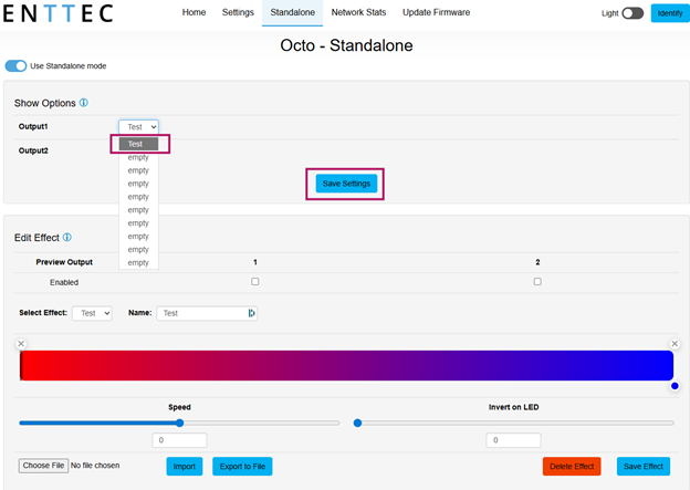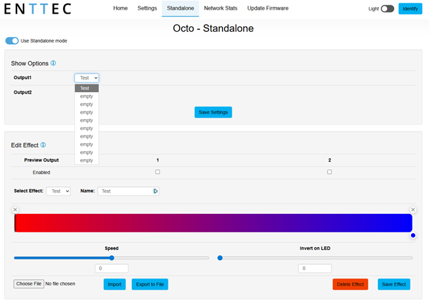 After you’ve created your first Standalone effect and saved that effect, you’ll notice that there isn't output to your pixel strip; this is the bug we have identified. In order to see your Standalone effect play, you simply need to select any other effect slot for your show options, save settings, then reselect your first effect.